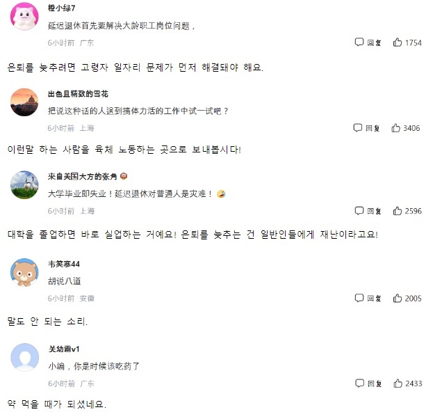 하지만 대안마다 또 따른 부작용이 우려되는 상황이다. 당장 은퇴 연령을 늦추는 방안에 대해서도 네티즌들의 생각은 사뭇 다르다. 중국 네티즌은 은퇴를 늦추려면 고령자 일자리 문제가 먼저 해결되어야 한다며 은퇴를 늦추는 것은 젊은 세대에게 재난이라는 의견을 보이고 있다.