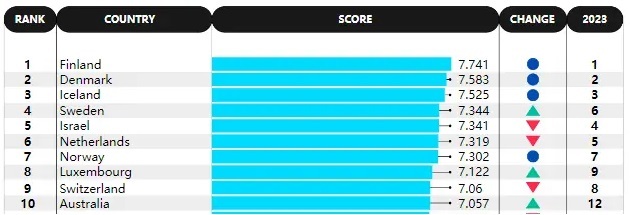 143개 조사 대상국 가운데 북유럽의 핀란드가 7년 연속 1위에 올라 세계에서 가장 행복한 국가로 자리매김 하였으며 덴마크와 아이슬란드 스웨덴이 그 뒤를 이었다. 올해 세계 행복지수 Top 10 국가는 다음과 같다.