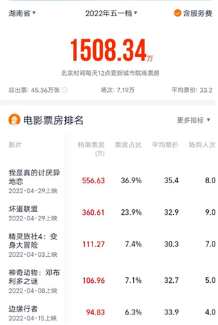 최근 후난성위원회 홍보영화처에 따르면 지난 노동절 연휴 기간 중국의 박스오피스가 전국 2억9600만 위안으로 잠정 집계됐다.