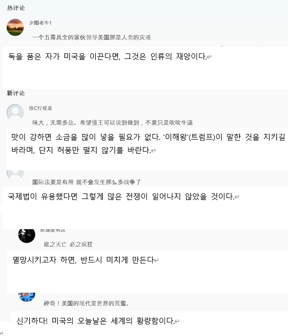 중국 매체들은 “트럼프의 거침없는 발언에 대해, 일부 미국 전문가들은 "미제국주의가 돌아왔다"고 경고했다”며 “하지만 사실, "미제국주의"는 결코 사라진 적이 없었다. 세계 각국이 "늑대와 춤추며" 평화와 생존을 구하려는 환상을 가지고 있다면, 하루빨리 깨어나야 할 것”이라고 재차 강조했다.