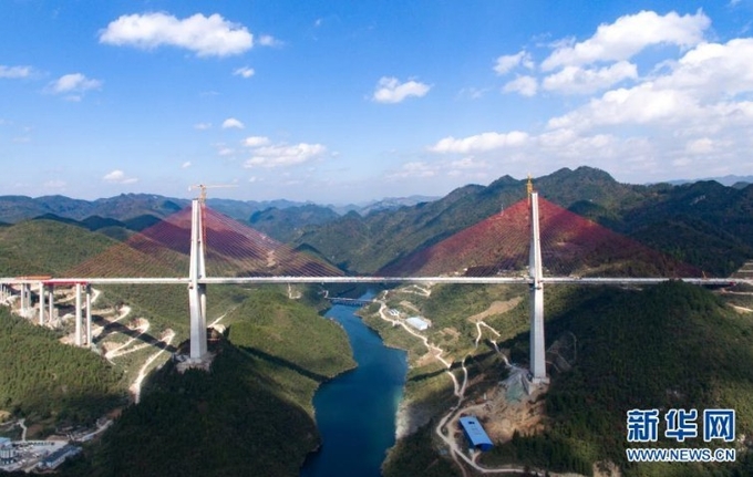 중국관영 신화사의 카메라가 코로나19로 중단됐다 지난 4월부터 건설을 재개한 지난 3일에 완공된 궤이저우성 준이시 인근의 계곡을 가로지르는 준위고속도로 상지앙대교( 遵余高速湘江大桥)의 모습을 담았다.