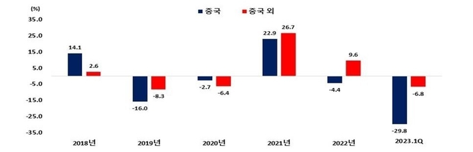 작년 대중국 수출은 4.4% 줄었지만, 중국을 뺀 시장으로의 수출은 9.6% 증가했다. 올해 1분기에도 대중국 수출이 29.8% 감소했지만 중국 이외 시장 수출은 6.8% 감소하는 데 그쳤다.