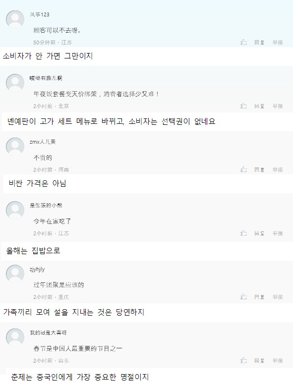 '녠예판(年夜飯) 가격이 천정부지로 칫솟고 있다.'