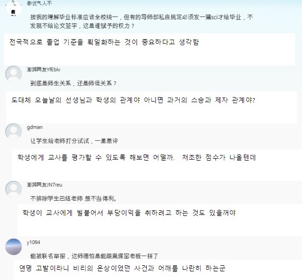펑파이신문은 대학원에서 이른바 ‘추악한 소문’이 연달아 터져나오는 것은 대학원생과 지도교수의 권력 불균형, 이른바 갑을관계 관행에서 비롯됐다고 평가했다.