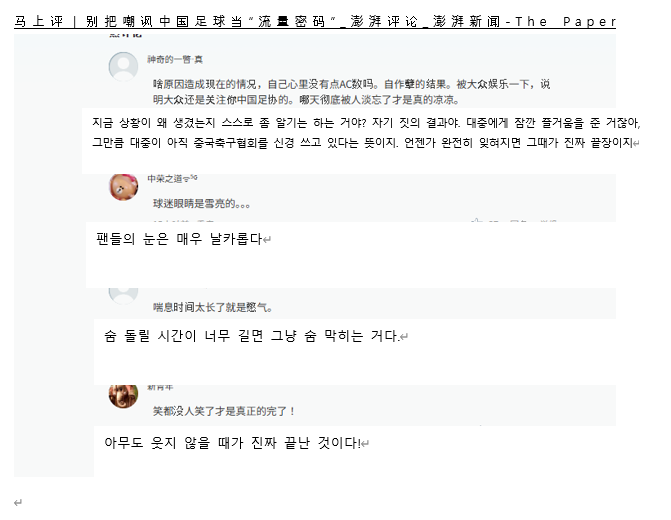 최근 펑파이 등 중국 매체들은 중국 온라인에서 축구협회 방안을 놓고 논란이 벌어지는 상황을 전하며 “축구협회 관리방법은 사설 도박 등을 막기 위한 조치”라고 편을 들었다.
