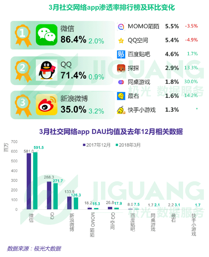 상단의 자료 중 첫 번째 자료는 SNS App의 사용률과 2017년 12월 대비 2018 년 3월의 App 사용률의 증가량을 보여주고 있습니다. 두 번째 자료는 2017년 12월의 일평균 사용자 수와 2018 년 3월의 일평균 사용자 수를 보여주고 있는 자료입니다. SNS App의 경우 가장 많은 사용률을 보이는 것은 微信으로 핸드폰 이용자의 86.4%가 微信을 사용하고 있었습니다. 그 뒤를 QQ와 微博가 잇고 있었습니다. 일평균 사용량의 경우 역시 微信, QQ, 微博 순으로 나타나고 있음을 확인할 수 있습니다. 중국의 양대 국민 메신저라고 할 수 있는 微信과 QQ의 점유율이 압도적임을 새삼 다시 느낄 수 있는 자료였습니다.