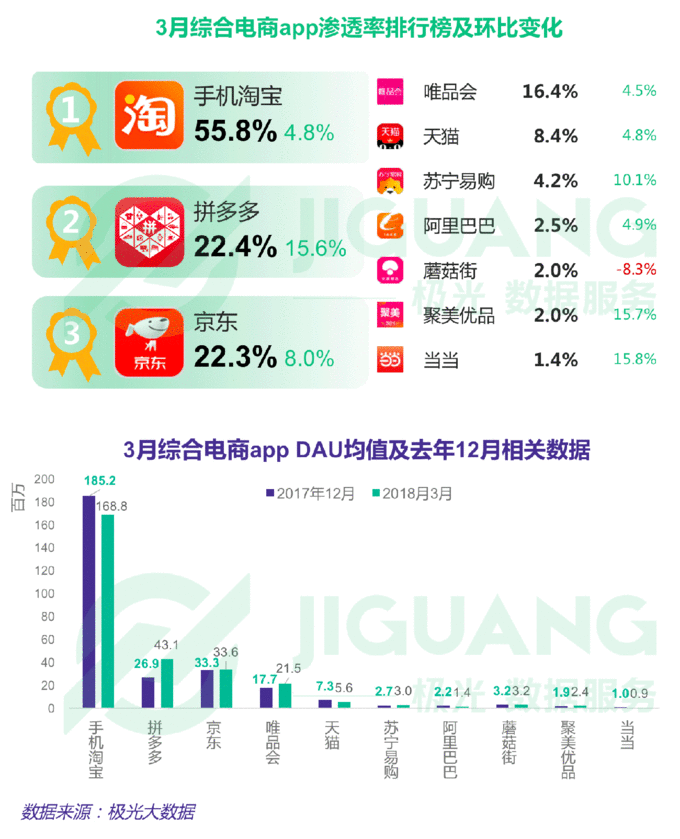 다음으로 전자 상거래 App의 순위를 보여주는 자료입니다. 전자 상거래 App의 경우 절반 이상인 55.8%의 사람들이 淘宝를 사용하고 있음을 확인할 수 있었습니다. 그리고 그 뒤를 이어 요즘 새롭게 주목을 받고 있는 전자 상거래 App인 拼多多가 京东을 제치고 22.4%의 이용률을 보이고 있었습니다. 拼多多의 상승세는 아래의 일평균 이용자 수에서도 확인할 수 있는데요 2017년 12월, 하루 약 2700만의 사람들이 사용하던 App를 2018 년 3월 4300만 명의 사람들이 사용하고 있음을 볼 수 있습니다. 拼多多의 상승세가 어디까지 이어질지 관심을 갖고 지켜봐야 할 것 같습니다.
