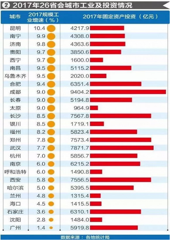 연구원들은 이번 연구는 주로 성도를 다룬 것으로, 이후에 직할시 및 부성급성시를 추가한다면 중국 전역의 경제 판도의 흐름을 알 수 있다고 밝혔습니다. 특히, 2017년 공업 발전 속도는 여전히 중서부 지역(쿤밍昆明, 난닝南宁, 구이양, 시닝西宁, 난창南昌 등)이 빠르지만 동부 지역(광저우广州, 하이커우, 항저우, 난징南京 등)은 여전히 발전이 더딘 것으로 나타났습니다.