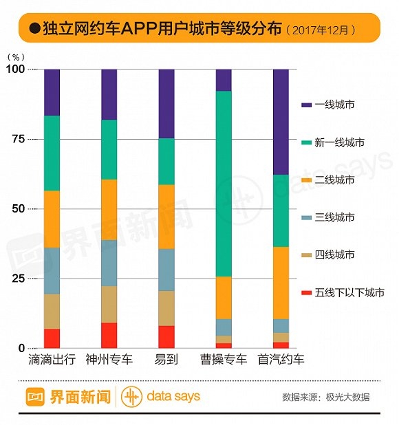 마지막으로 각급 도시별 콜택시 APP 사용 분포입니다. 디디추싱과 션저우좐처의 경우 전국적으로 고른 사용 분포를 보이고 있음을 확인할 수 있습니다. 이와 달리 챠오챠오다처曹操打车와 셔우치위에처首汽约车의 경우는 일선도시와 신일선도시에서 높은 사용률을 보이고 있음을 확인할 수 있습니다. 대도시에인 해당 도시들에서 환영을 받는 것은 차량을 선택할 수 있는 기능을 제공하는 등 챠오챠오다처와 셔우치위에처가 기타 어플과 차별된 전략을 사용하고 있기 때문인 것으로 보입니다.