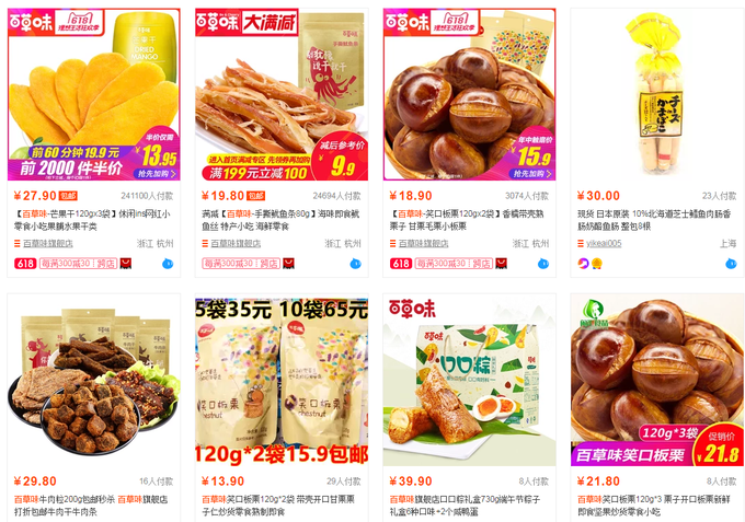 be&cheery/百草味는 식료품 브랜드로 주로 판매하는 상품으로는 육포, 건조 망고, 건조 오징어 등의 건조 식품과 캐슈넛, 땅콩, 마카다미아 등의 견과류 등이 있습니다. 다양한 맛과 다양한 형태의 건조 식품이 있었는데요, 육포의 경우도 사탕 형태, 스틱 형태, 일반 형태 등 다양한 모양이 있네요. 또한 견과류의 경우에도 한국에서 접하기 힘든 산사나무 열매, 해바라기 씨, 호박씨, 누에콩 등을 간식 형태로 팔고 있습니다.