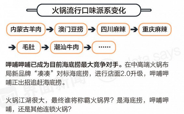 매번 변화하는 소비자들의 입맛은 수많은 훠궈 가게들의 폐업을 가져오면서 업체들의 순위 역시 바뀌는 모습을 나타냈습니다. 올해 훠궈업체 샤오페이양小肥羊은 일찍이 강호들이 즐비한 시장에서 사라졌습니다. 2015년 아오먼또우라오澳门豆捞는 순위가 5위 밖으로 밀려났고, 2017년에는 네이멍구内蒙古의 양고기로 대표되던 샤오웨이양小尾羊 역시 5위 밖으로 밀려났습니다.