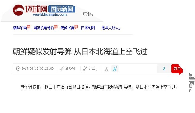 중국에서 오전 북한의 미사일 발사 소식을 발 빠르게 전했습니다. 시간이 오전 6시쯤이네요. 그런데 일본 보도를 인용한 것이군요. 쩝
