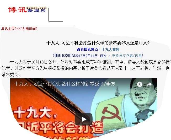 어쨌든 중국 19차 당대회가 다가오면서 각종 설도 난무하고 있습니다. 이번에 보쉰이 상무위원 수에도 변화가 있을 수 있다고 전하네요. 스스로도 여러 설 중 하나라고 했습니다.