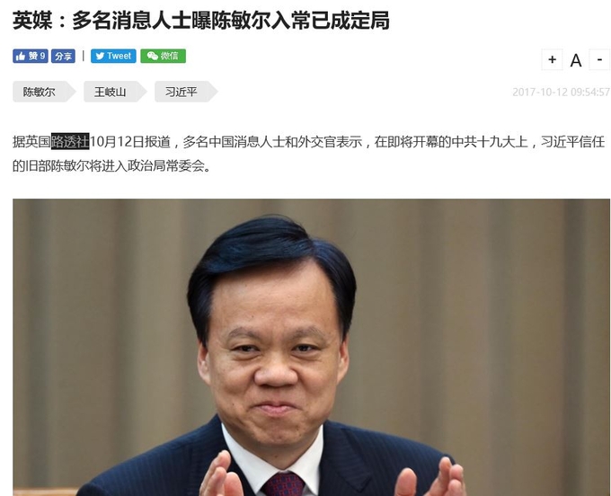 본래 후 서기는 시진핑 후대를 이어갈 차세대 지도자로 주목을 받았던 인물이었는데 말이죠. 19차 당대회 정말 복잡한 권력의 줄다리기 싸움입니다. 그래서 더 재미있는지 모릅니다. 보도를 한 곳은 로이터인데, 서방 매체 가운데 나름 중국 속보, 정가 분석에서 권위가 있습니다.