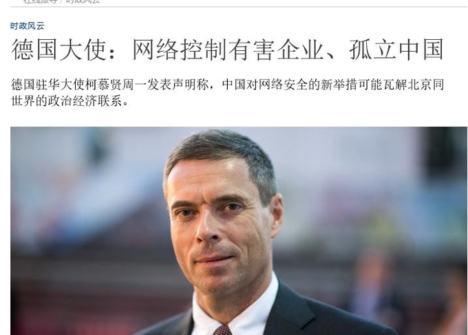 "인터넷 검열은 기업에 불리하고 중국을 고립시킬 것이다." 독일 대사의 이름은 미하엘 클라우스 입니다.