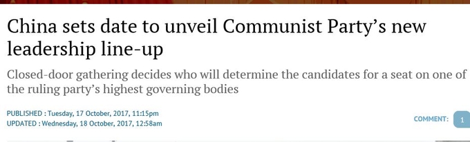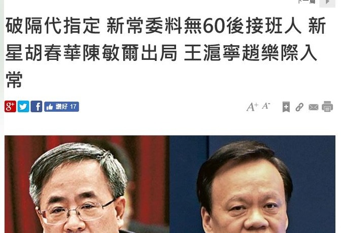우선 의외로 후춘화, 천민얼 두 당서기가 19기 상무위원 인선에서 빠졌다는 보쉰의 보도를 홍콩의 밍바오가 그대로 받아서 전했습니다. 즉 그만큼 보쉰 보도의 가능성이 높다는 것입니다.