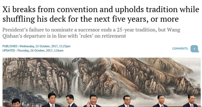 이런 가운데 홍콩 매체 가운데 영자지 사우스차이나모닝포스트는 시 주석이 격대지정(세대를 넘어 후계자를 지정하는 관례)를 깼지만, 왕치산 서기가 연령 제한에 맞춰 은퇴하도록 전통은 지켰다고 평했습니다.