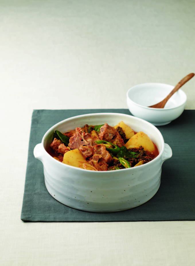 脊骨土豆汤过去是全罗道的地方饮食。当时,因不忍杀耕牛,当地人就煮猪脊骨,放入各类蔬菜烹制滋补汤来强筋壮骨,或用于患者进补。脊骨土豆汤以其美味名扬全国,征服了人们的胃,仁川码头的工人们,更是对脊骨土豆汤钟爱有加,因为它作为工人餐点,再合适不过了,一来它是下酒菜;二来它热量高,既丰盛又实惠,且味道浓香;三来准备食材较省事,一回可熬出一大锅汤。此外,猪脊骨含有丰富的蛋白质、钙、维生素B1等营养成分,其营养价值得到认证后,很快成为了男女老少皆爱的滋补膳食。