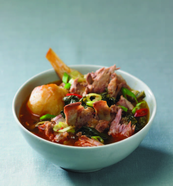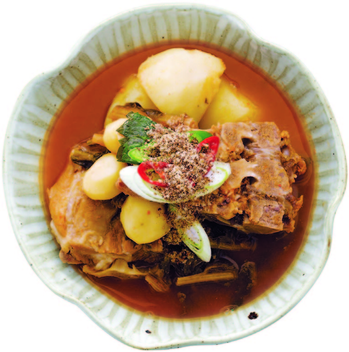脊骨土豆汤是将猪脊骨煮透后,配上土豆、白菜帮、荏胡麻、苏子叶、葱、蒜等食材,熬出来的鲜香爽辣的美味汤品。脊骨土豆汤味道香浓,啃排骨的过程更是其乐无穷。脊骨土豆汤现煮现吃,吃完土豆排骨,再用剩的汤炒饭,香辣可口,别具风味。脊骨土豆汤在早上可以当作醒酒汤来食用,在冷飕飕的日子可以当作一顿正餐,在深夜,不仅可以当作夜宵,还可以当作下酒菜。