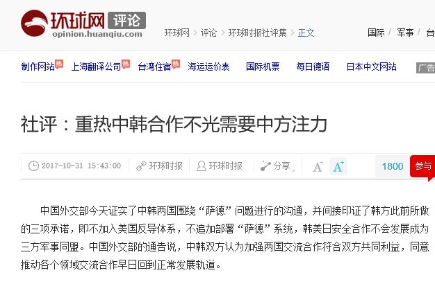 어제 31일 한중 외교당국이 함께 사드 갈등으로 인한 불편한 관계를 청산하겠다는 데 합의했다고 밝혔습니다. 이에 대해 환추스바오가 한중관계 회복은 중국 한쪽만의 힘으로 안된다며 한국 측도 노력해야 한다고 평했네요.