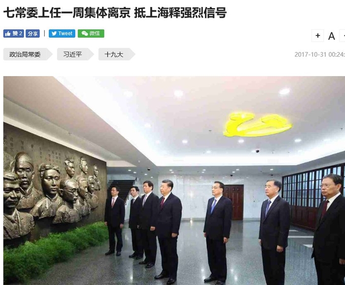 시진핑 주석을 비롯한 중국 상무위원 7명 전원이 상하이 중국 공산당 창당 성지를 방문하고 있습니다. 신시대 '당의 일체 영도'를 선언하고 당의 발원지를 방문해 초심을 잃지 않겠다고 하는 것입니다.