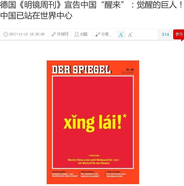 환추스바오는 독일의 유명한 시사잡지 슈피겔이 중국 특집을 냈다고 자랑하네요.
