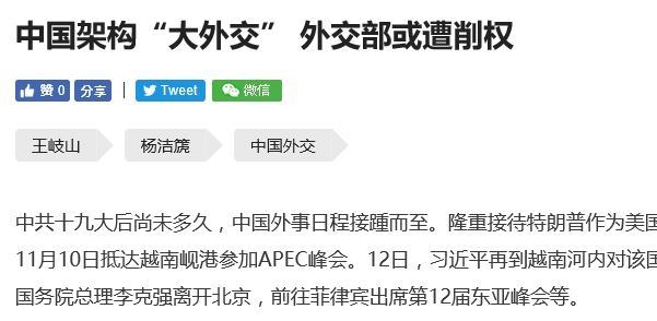 과거 도광양회(韬光养晦) 시절 외교부를 통해 국제 사회 움직임을 분석하고 그에 따라 대응하는 수준이었다면, 이제 시 주석이 양제츠(杨洁篪) 정치국 위원을 대동하고 직접 챙기는 '대 외교 시대'를 맞았다고 하네요.