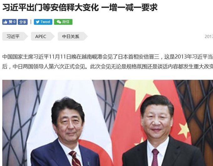 많은 외신들이 중국의 일본과 관계 개선에 관심을 보였습니다. 시 주석이 문 앞까지 나와 아베 총리를 맞았다고 하네요.