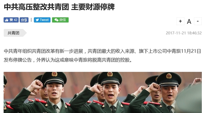 중국은 이뿐 아니라 공청단 개혁 조치도 박차를 가하고 있네요. 공청단의 돈을 차단하고 있다는 소식이 있습니다.