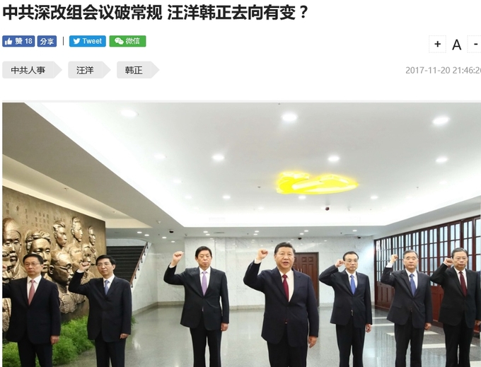 중국 개혁심화영도소조 회의가 열렸던 것을 전해드렸는데, 중화권 매체 둬웨이多维는 신속하게 출석 상무위원의 명단을 통해 19기 상무위원들의 직무 배정이 이전과 달라질 수 있다는 분석을 내놓아 주목됩니다.