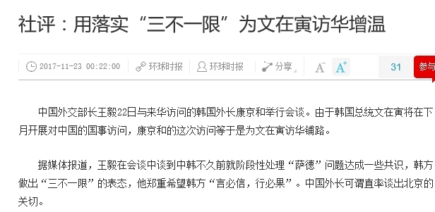 중국에서는 우리 강경화 외교부 장관과 왕이王毅 중국 외교부장의 회담 소식도 중요 뉴스였습니다. 모두가 우리에게 말로 한 것을 행동으로 보이라고 합니다. 환추스바오环球时报는 아예 사설까지 썼네요.