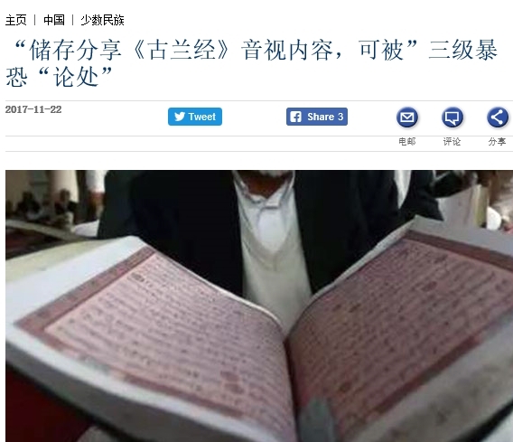 자유아시아방송은 이슬람 성전인 코란 앱을 친구에게 소개한 이가 중국 신장에서 3급 폭동 음란물 유포 혐의로 구류를 살았다고 전하고 있습니다.