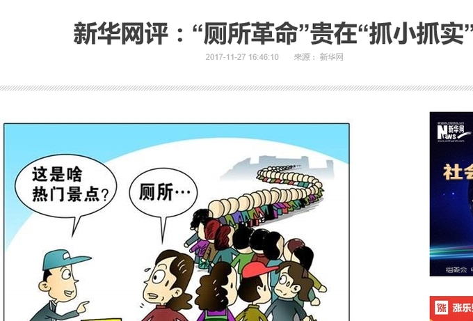 신화新华통신은 관련해 사설까지 썼네요. 정말 10년 전 중국 화장실에서 옆 사람과 얼굴을 마주고 이야기하며 볼 일을 봤던 기억이 새롭네요.