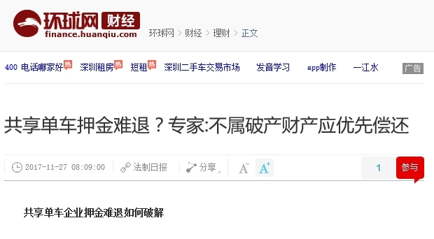 다음은 한동안 중국 공유경제, IT 혁명의 상징처럼 주목받은 '공유 자전거' 관련 기사입니다. 이미 쏟아지는 자전거 쓰레기가 새로운 문제가 되고 있는 가운데 부실 공유 자전거 회사들이 부도를 내면서 서민들의 보증금 환불이 새롭게 문제가 되고 있다고 합니다.