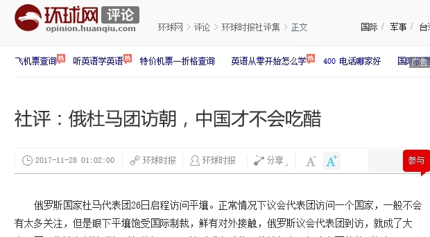 북한은 쑹타오 특사보다 더 환영하는 모습을 보였는지, 각국이 중국의 모양새가 좀 그렇다고 지적을 한 모양입니다. 중국 환추스바오环球时报가 "우리가 질투를 한다고?"하며 발끈, "전혀, 오히려 소련의 활동을 지지한다"고 사설을 썼네요.