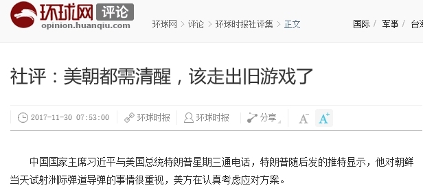 환추스바오环球时报는 미국과 북한에게 "모두 과거 잘못을 되풀이할 것인가?"라며 양측의 냉정한 태도를 요구하고 있네요. 이미 루비콘 강을 건넌 것 같은데 말이죠.
