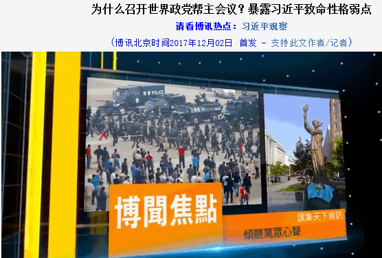 중화권 매체 보쉰博讯은 3일 폐막한 세계정당대회를 가장 삐딱한 눈으로 봤는데, 폐막 후 이번 대회를 통해 시 주석이 공을 탐하고 세계 정당 전통에 무식한 면을 드러냈다고 비판했네요.