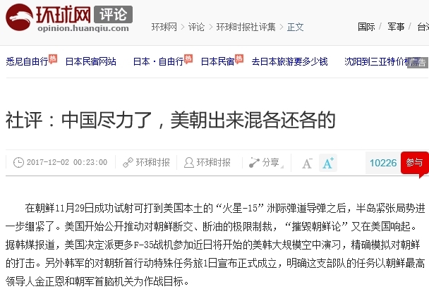 중국 환추스바오环球时报는 연일 북핵 문제로 자신들을 끌어들이지 말라고 목소리를 높이고 있습니다. "우리도 할 만큼 했다. 이제 미국과 북한 둘이서 해결하라"라고 하네요.