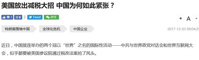 미국이 사상 최대의 감세안을 시행키로 하자 중국이 긴장하고 나섰습니다. 중국 인터넷 여론에서 중국의 세금이 높다는 불만이 많아지고 있다고 둬웨이多维가 전합니다.