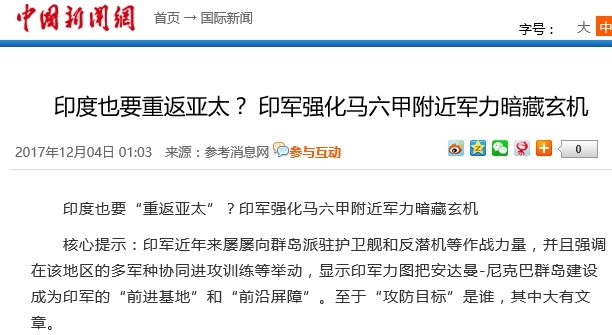 중국 관영 매체들은 또 인도의 태평양 주변 군사력 강화에 관심을 표하고 있습니다. 중궈신원왕中国新闻网은 인도도 '태평양 회귀하나?"라며 인도가 말라카 일대 군사력을 강화하고 있다고 전했습니다.