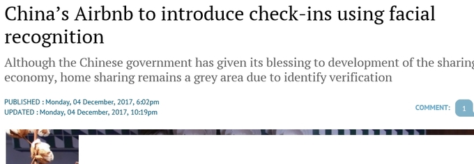 중국 에어 BNB가 안면인식 기술을 도입한다고 합니다. 중국의 안면인식 기술 활용은 세계 최고 수준입니다.