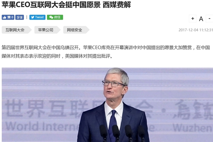 여기에 팀 쿡 애플 최고경영자가 참석해 중국의 인터넷 발전 계획을 칭찬했는데, 미국에서 서버를 둔 더웨이多维 보도에 따르면 중국에서 환영을 받고 미국에서는 비판을 받았다고 합니다.