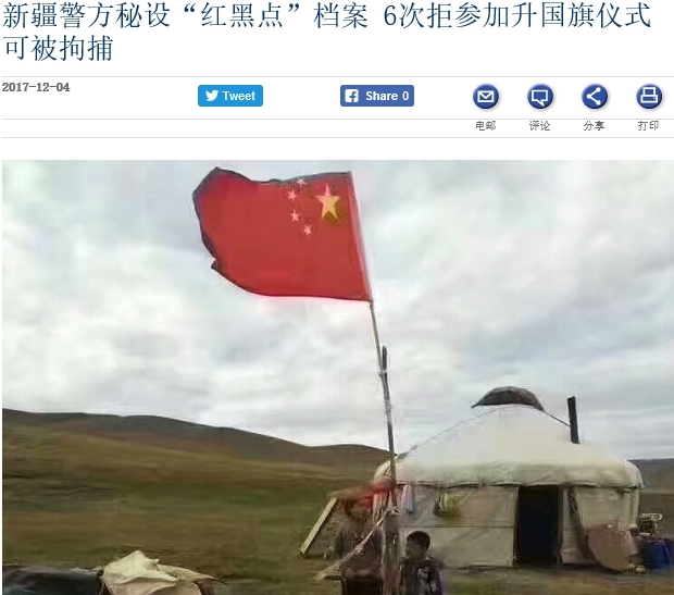 자유아시아방송이 신장 정부 당국이 6차례 국기 게양식에 참석을 거부한 주민을 구류했다고 고발했네요.
