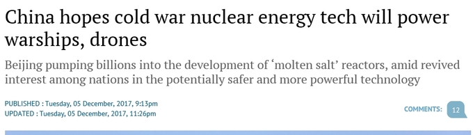 중국은 이 원자력으로 핵 동력을 가진 드론 등을 만들 것이라고 하네요.