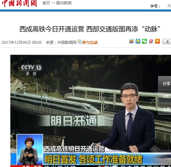 오늘부터 소위 '시청'西成 고속철이라 불리는 서부지역 고속철도가 전면 개통했다고 중궈신원왕中国新闻网이 전합니다.