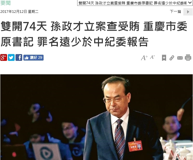 중국 쑨정차이孙政才 조사가 검찰로 넘어갔습니다. 지난 7월 낙마 후 140여 일 만입니다. 정식 사법절차를 밟는 것입니다. 죄목은 당초 중앙기율이가 제기했던 것보다는 줄었다고 합니다.