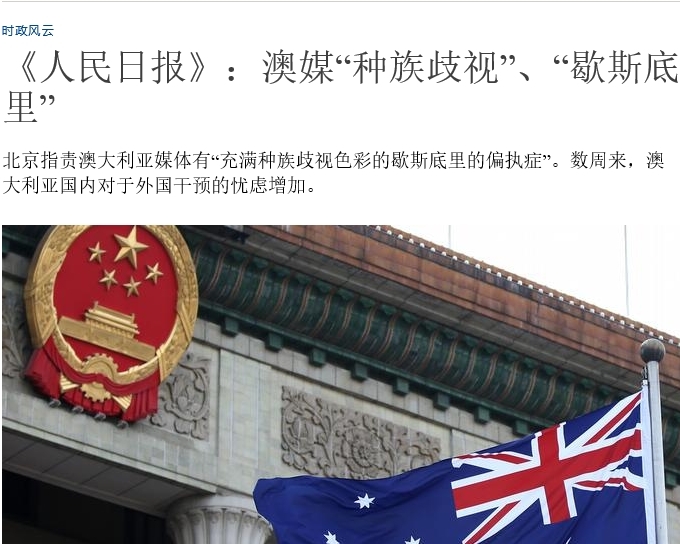 중국은 호주와도 갈등을 빚고 있는데, 당 기관지 런민르바오人民日报가 의외로 "인종차별", "히스테리"라는 말을 써가며 호주 매체들을 비난했습니다. 자매지 환추스바오를 닮아가는 건 아니겠죠?