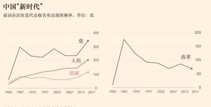 중국 신시대는 당이라는 자가 가장 많이 사용됐고, 개혁이란 단어는 1987년이래 가장 적게 등장을 했군요.