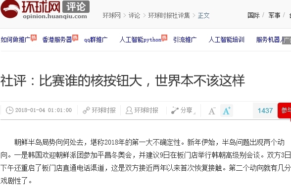 환추스바오는 관련 소식 바로 상단에 "누구의 핵 단추가 큰지 경쟁을 하다니, 세계가 이래선 안된다"고 논평까지 썼네요.