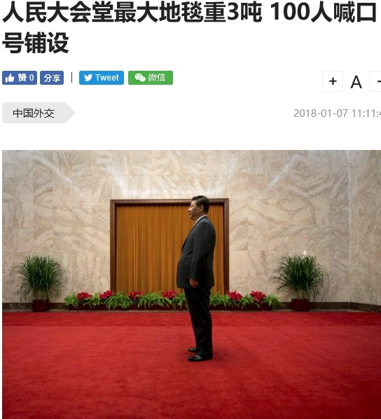 중국 인민 대회당은 그 규모가 크고 화려하기로 유명합니다. 최근 대회당 발간 잡지에 따르면 2018 년 대회당의 분위기를 더욱 장엄하게 만들기 위해 무려 세로 23m 가로 16m 크기의 카펫을 제조했다고 합니다. 톈진에서 만들어졌다고 합니다. 그런데 크기도 크기지만 무게가 무려 3t에 달한다고 합니다. 어떻게 바닥에 깔까요? 100명이 동원돼 구호에 맞춰 겨우 깐다고 합니다.